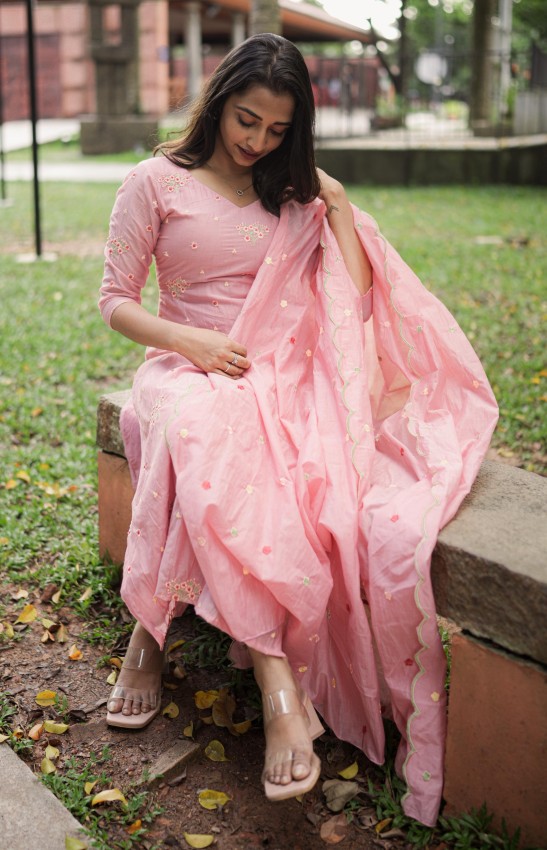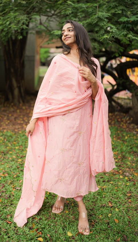 Show related productsOnion pink Mul Chanderi Premium threadwork kurta top set with scalloped dupatta