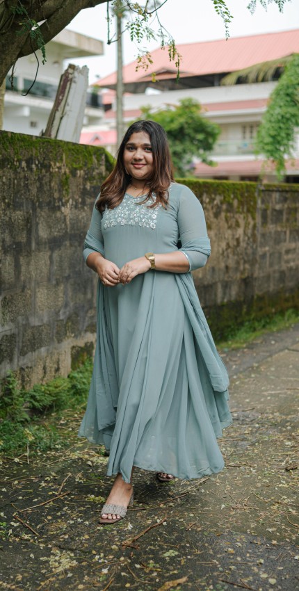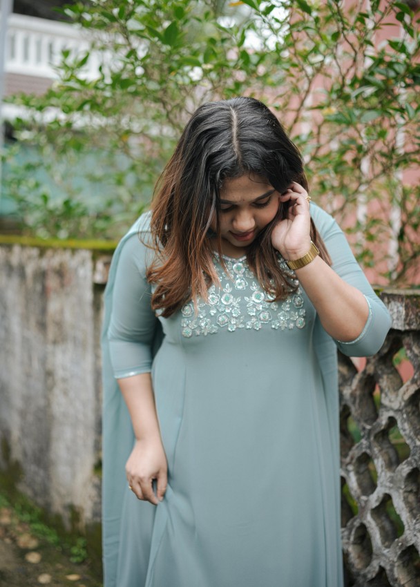 Flared panel aline top with beautiful pastel silver floral pattern handwork on yolk and border work on sleeve end