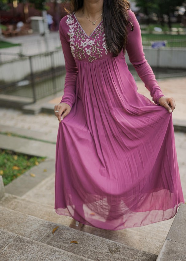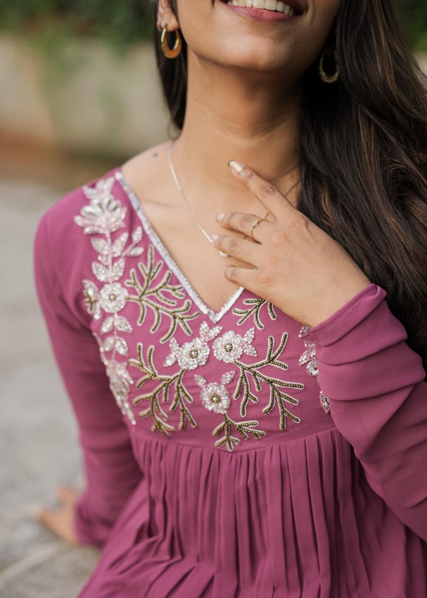 Flared frill aline top with beautiful r floral pattern handwork on yolk and churri sleeves