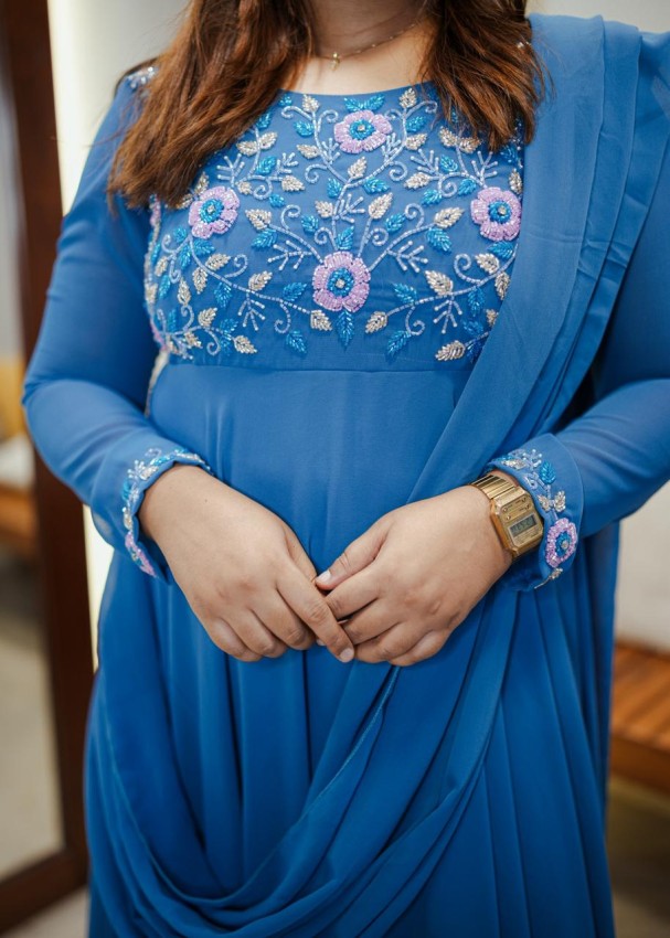 Draped Saree gown with beautiful heavy handwork on full yolk and sleeve end