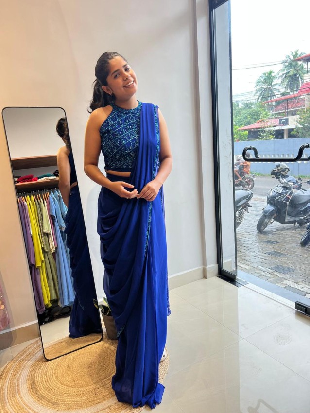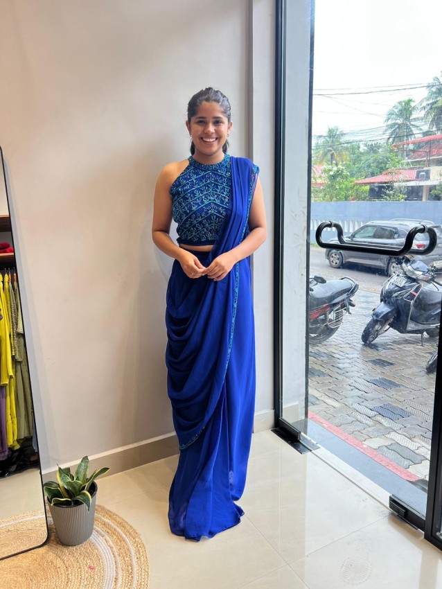 -It features a heavily hand-worked blouse paired with a pleated skirt and a pleated dupatta, detailed with intricate work on one side. When worn together, the ensemble beautifully mimics the drape and silhouette of a traditional sari. This look allows women to achieve timeless style without the complexity of traditional draping.