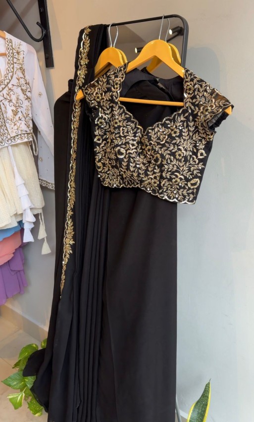 This three-piece drapes kit features a fully stitched blouse with premium Zari and zardozi handwork, paired with a draped skirt and a pleated dupatta with matching handwork on one side, creating the graceful look of a saree with the richness of a lehenga. Customizable in any color.