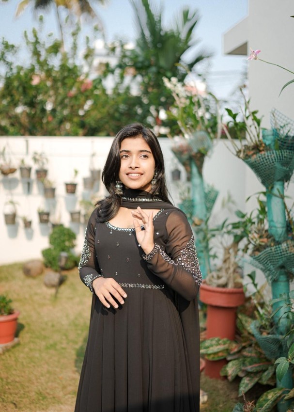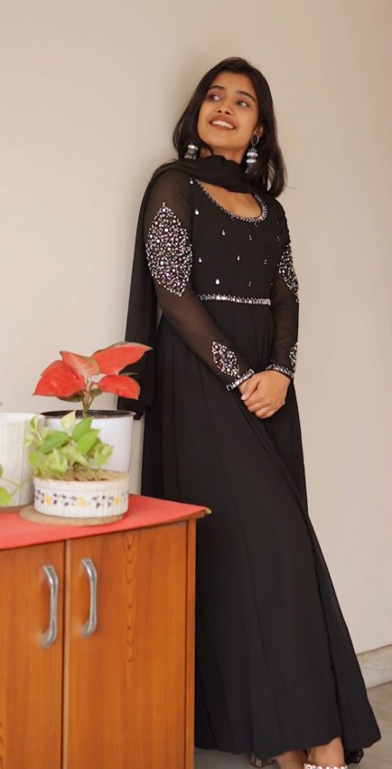Model wearing- BLACK COLOUR , panelcut openAnarkali top with one sidr mirror duppatta.