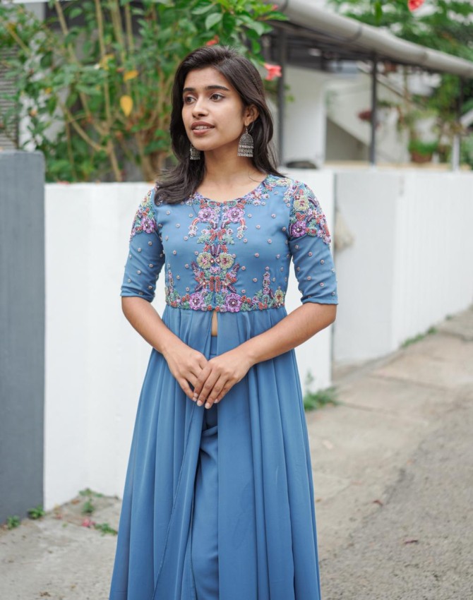 Model wearing- ASH BLUE COLOUR , panelcut open jacket Anarkali top with semi pencil bottom-
