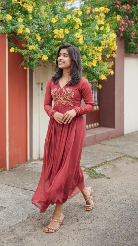 This budget-friendly 3-panel frill A-line features a soft, flowy silhouette with elegant gathers . The yolk is highlighted with subtle handcrafted detailing . Available for customization in any color of your choice, making it perfect for simple occasions.