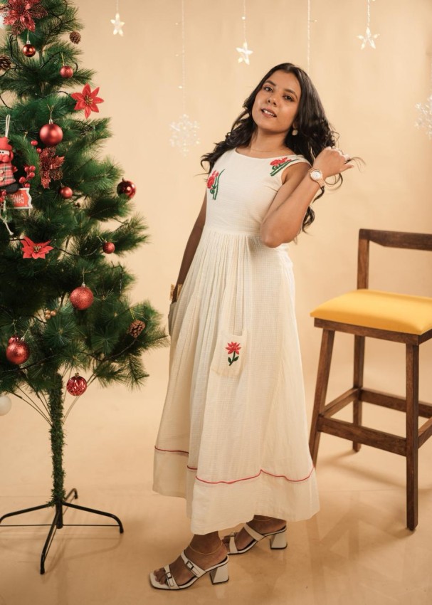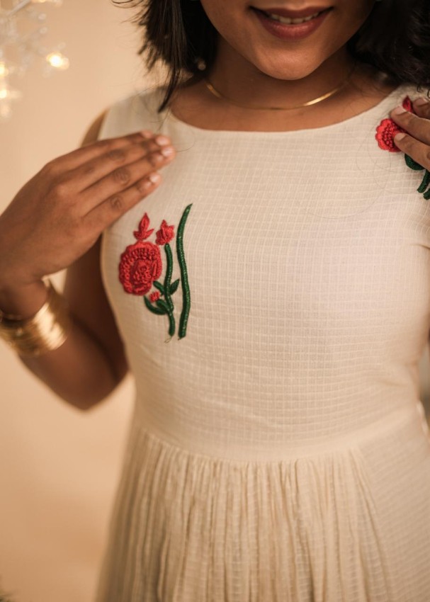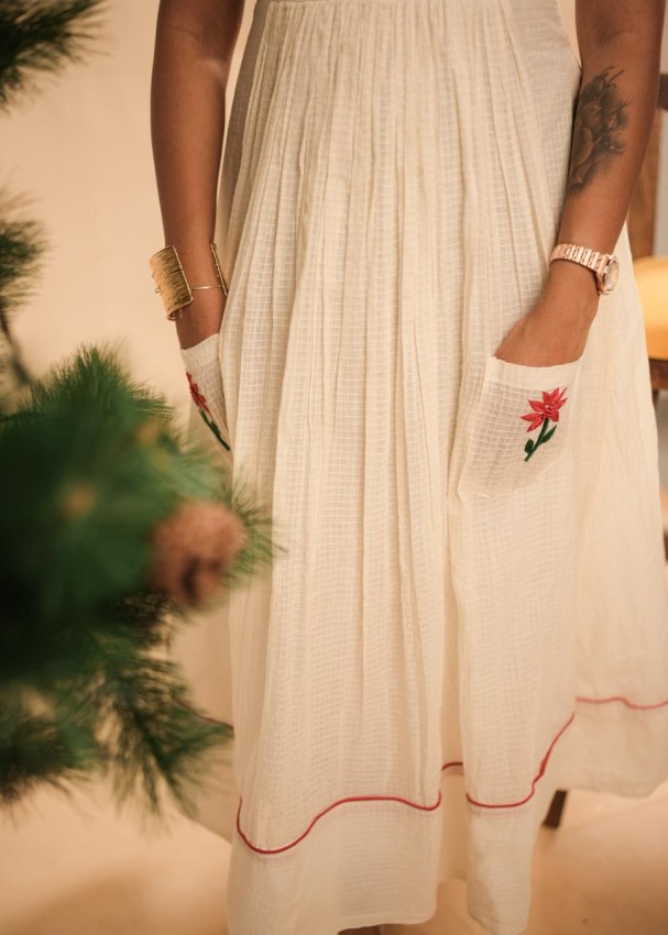 This elegant dress in soft net kota fabric features intricate red floral threadwork motifs that add a festive charm. The flared silhouette is accentuated with delicate red piping at the hem, enhancing its graceful flow. Perfect for Christmas celebrations, it’s a timeless piece that can be beautifully reused for other occasions too.