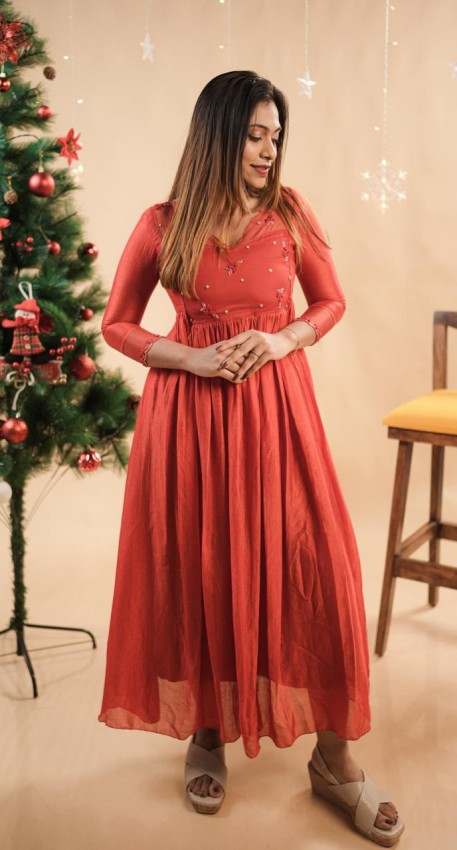 This elegant frill A-line dress is crafted in luxurious Badri silk with a sheer organza yoke, creating a soft, graceful silhouette. The delicate red and silver handwork adds a festive sparkle, making it perfect for special occasions. A timeless piece available in a flattering fit for effortless festive charm.