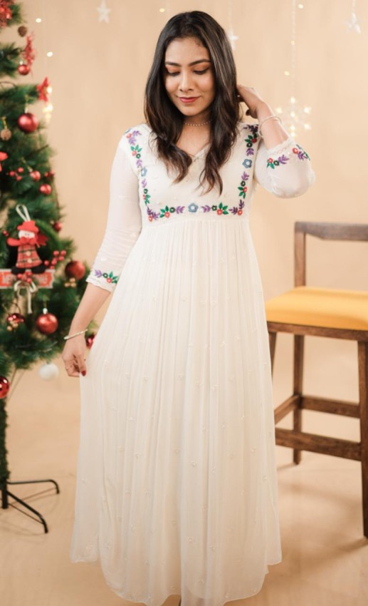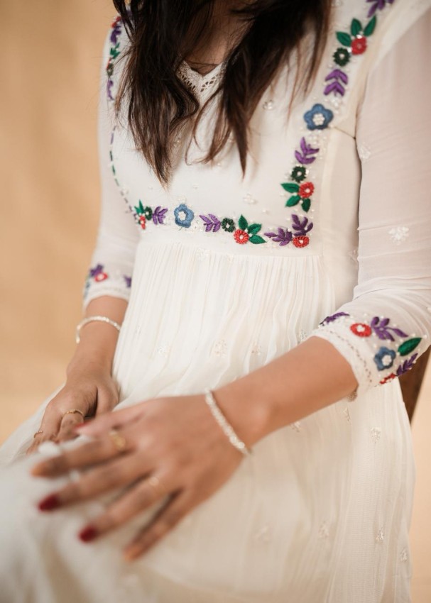 White frill Aline with all over top Butta white threadwork and floral motif multithread work on yolk and sleeves . Paired with white crochet lace on neckline and sleeve end