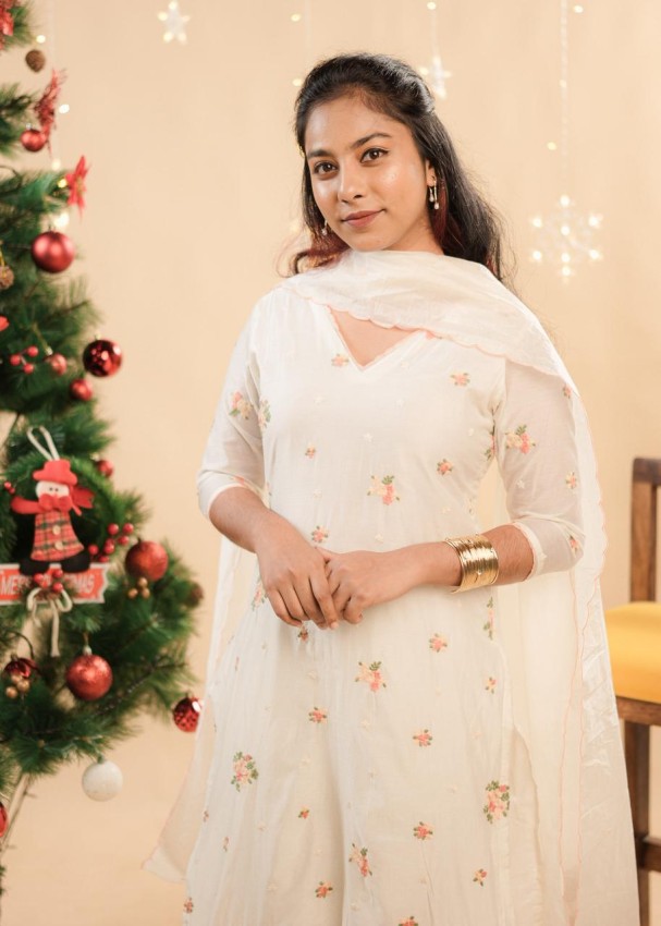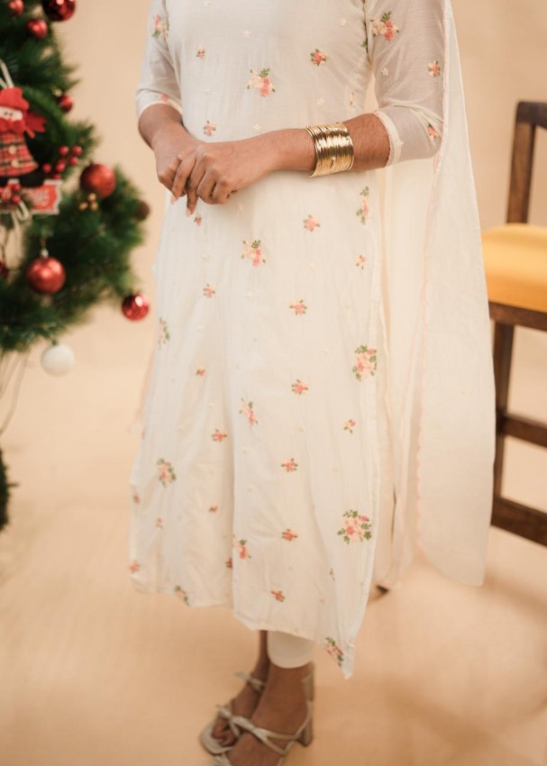 Paired with 2 side scalloped dupatta plain chanderi and pencil bottom.
