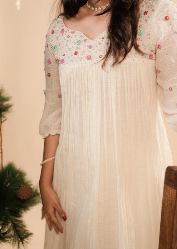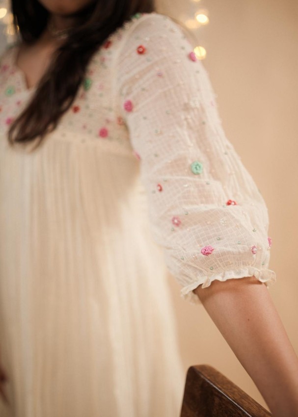 Soft net kotta material frill dress with pearls and muti color threadwork all over yolk and sleeves with elastic on end .